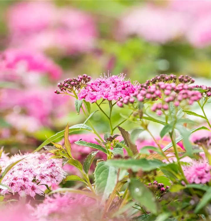 Das zu den Rosengewächsen gehörige Ziergehölz rosa Zwergspirre 'Little Princess' besitzt große Blütenstände, die sich aus unzähligen Einzelblüten rosafarbener Krone zusammensetzen. Mit seiner geringen Höhe und einem buschigen Wuchs begeistert der sommergrüne Strauch. Das ungeteilte Laub ist ungeteilt, besitzt einen gesägten bis gezahnten Rand und ist von leuchtend grüner Farbe.