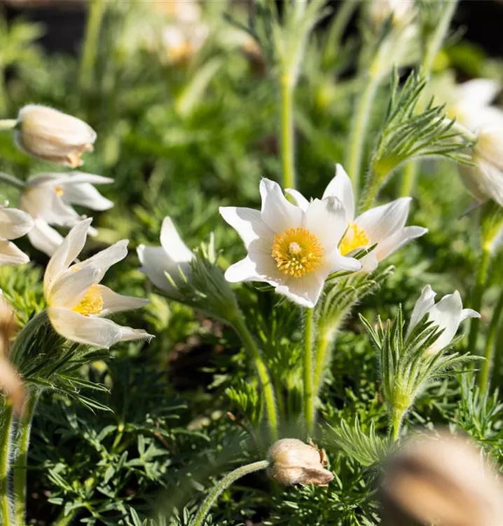 Die Weißblühende Garten-Kuhschelle 'Alba' weist eine gute Frosthärte auf.