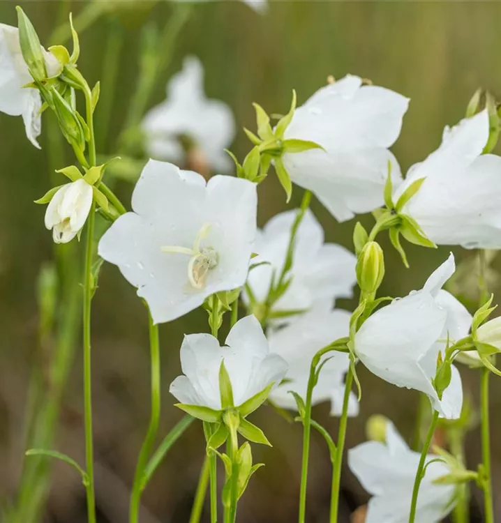 Man kann sich kaum satt sehen an den hübschen, breitglockigen Blüten der Pfirsichblättrigen Glockenblume Grandiflora Alba. In lockeren Trauben stehend bieten die aparten Schönheiten einen eindrucksvollen Anblick. Bis zu 90 cm an Wuchshöhe kann die in Europa heimische Art erreichen. Die weißen Blüten erscheinen zwischen Juni und Juli. Damit Sie die Pflanze mit reicher Blüte belohnt, benötigt sie einen durchlässigen und nährstoffreichen Boden. Die Pfirsichblättrigen Glockenblumen Alba sähen sich selbst aus.