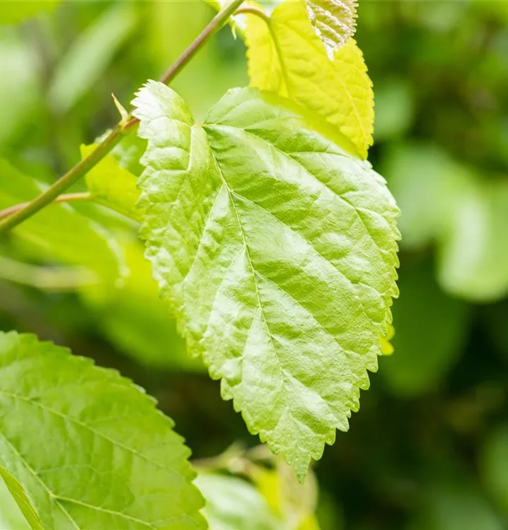 Die sommergrünen Blätter der Weiße Maulbeere sind dunkelgrün, herzförmig, wechselständig. Hellgrüner Austrieb. Weiße Maulbeere zeigt sich leuchtend gelb im Herbst.