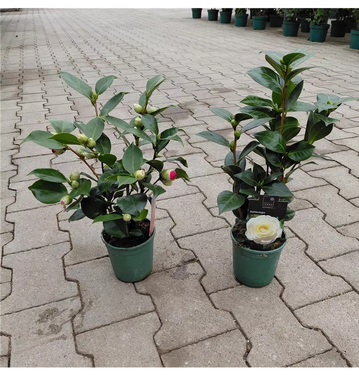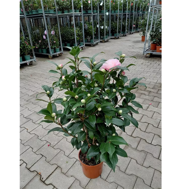 Japanische Kamelie ist ein aufrecht wachsender Strauch, der eine Höhe von 2 - 3 m und eine Breite von 1,5 - 2 m erreichen kann.
