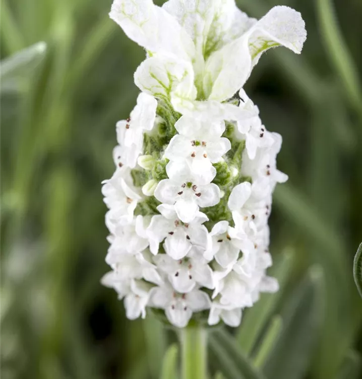 Die wintergrünen Blätter des Garten-Schopf-Lavendels sind grau-grün, lanzettlich.