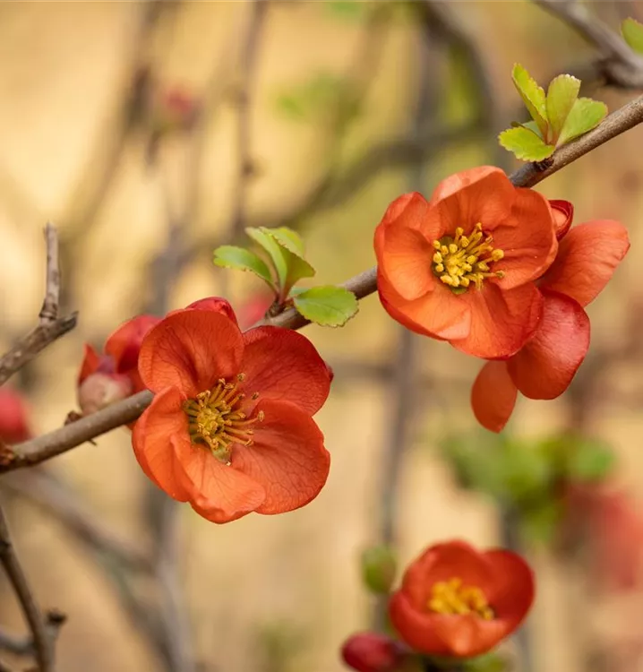 Die Zierquitte 'Cido'® (Chaenomeles japonica) ist ein ausladender Kleinstrauch mit dekorativen, gelben, birnenförmigen, runden Früchten. Diese verströmen einen angenehmen Duft. Die orange-roten Blüten erscheinen von Mai bis Juni.