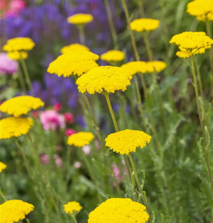 Achillea filipendulina 'Parker' bildet in Dolden angeordnete, gelbe Blüten ab Juni. Diese verströmen einen angenehmen Duft. Bei richtiger Pflege Nachblüte im September.