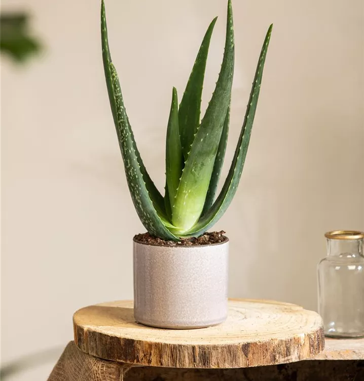 Die Echte Aloe (Aloe vera) zählt zu den pflegeleichten Pflanzen und besitzt hellgrüne, dickfleischige Blätter. Diese rosettenartige und sukkulente Pflanze gedeiht am besten an einem sonnigen Standort.