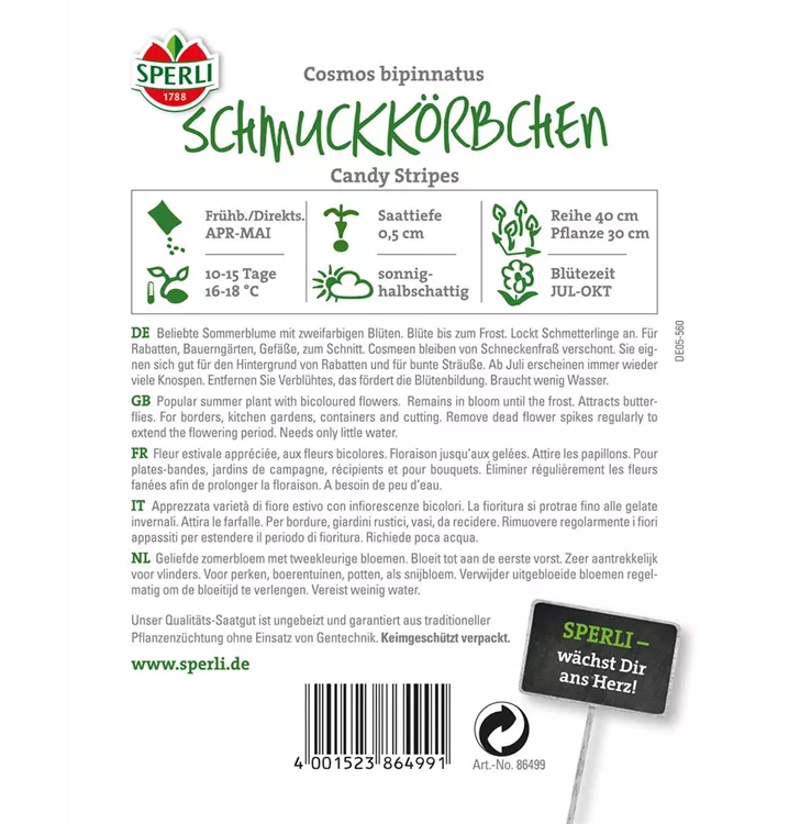 Das Fiederblättrige Schmuckkörbchen 'Sensation' (Cosmos bipinnatus) ist eine beliebte Pflanze für den Balkon. Die unzähligen Blüten erscheinen, je nach Sorte, in verschiedenen Farben die ganze Saison hindurch. Ein sonniger Standort und ein durchlässiges Substrat werden bevorzugt.