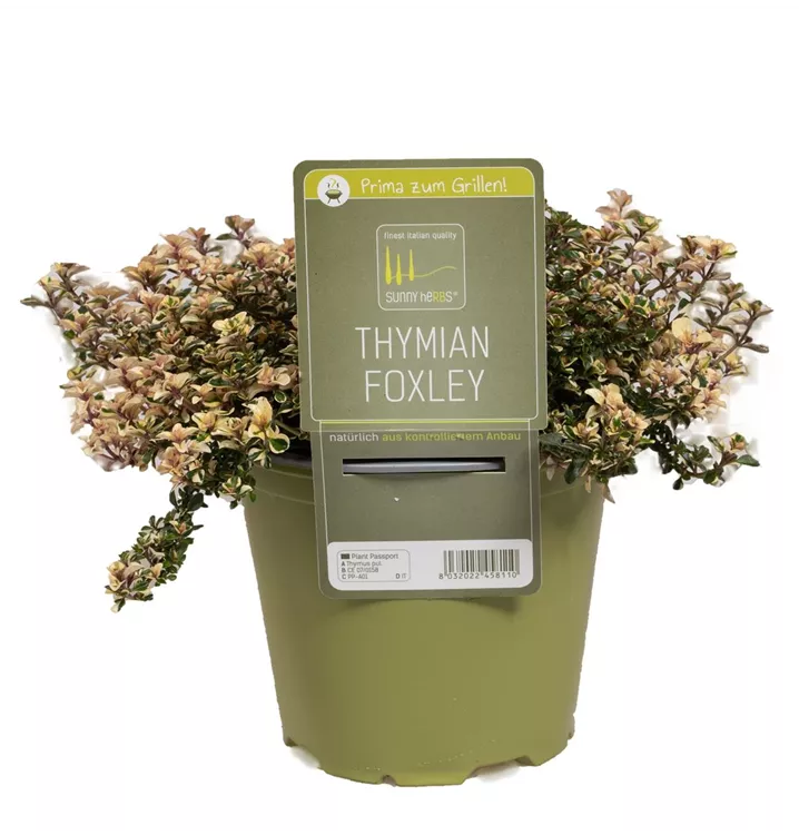 Der Zitronen-Thymian 'Foxley' (Thymus x citriodorus) ist eine Kräuterpflanze mit einem aromatischen Geschmack. Seine dunkelgrünen Blätter sind eiförmig. Für das optimale Wachstum des Zitronen-Thymians 'Foxley' werden ein sonniger Standort und durchlässiger, nährstoffreicher Boden benötigt.