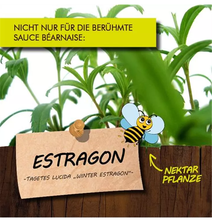 Der Französische Estragon (Artemisia dracunculus) ist eine Kräuterpflanze mit einem würzigen, milden Geschmack. Seine dunkelgrünen Blätter sind lanzettlich. Für das optimale Wachstum des Französischen Estragons werden ein sonniger Standort und durchlässiger, nährstoffreicher Boden benötigt.