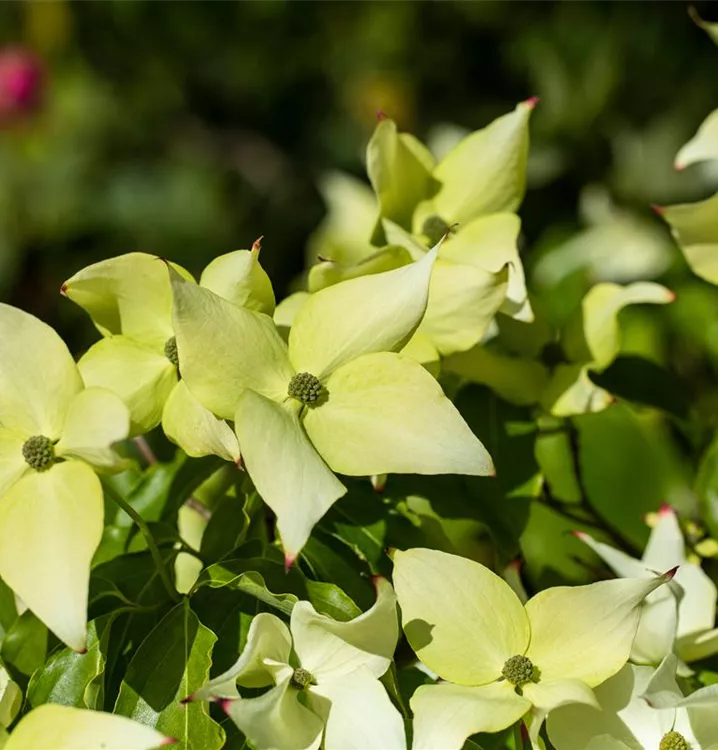 Der Japanische Blumen-Hartriegel 'Schmetterling' (Cornus kousa chinensis) ist ein aufrechter, strauchartiger, straffer Großstrauch mit dekorativen, rosaroten Früchten. Die cremeweißen, in Dolden angeordneten Blüten erscheinen im Juni.
