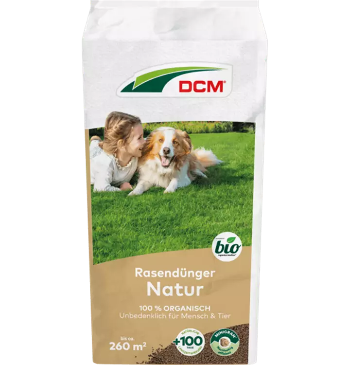 Ausgewogener, 100 % organischer Dünger mit Langzeitwirkung für einen dichten, grünen Rasen, der Moos und Unkraut verdrängt