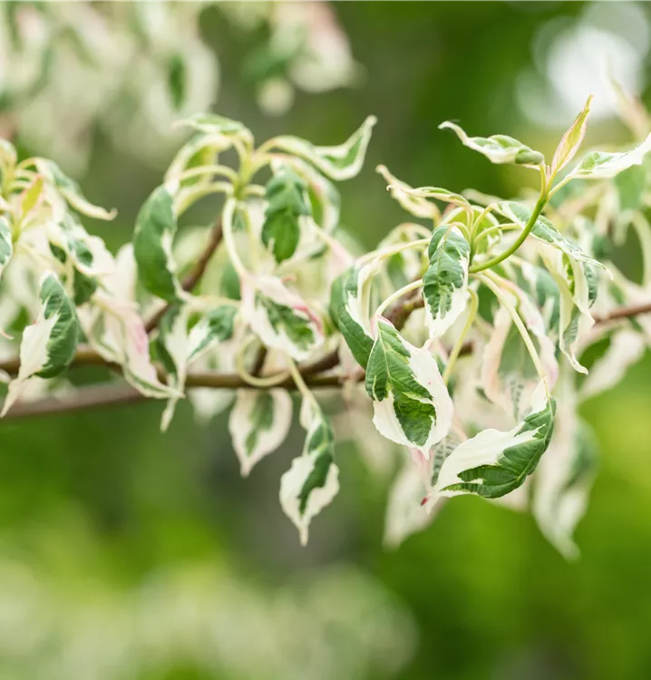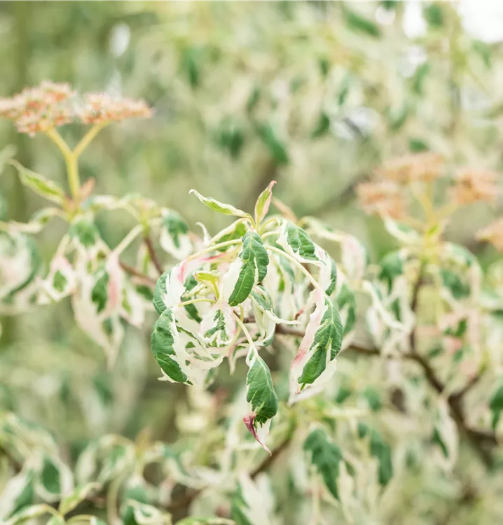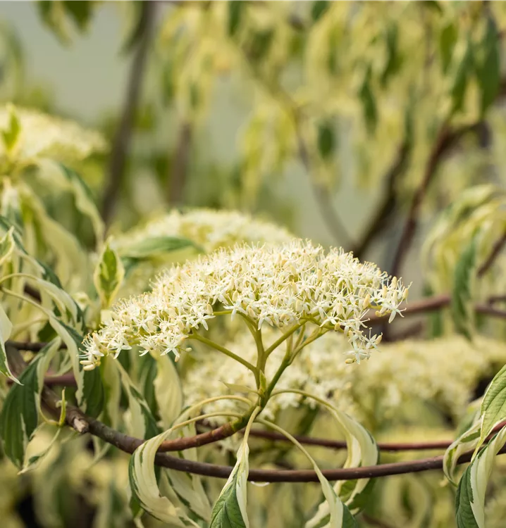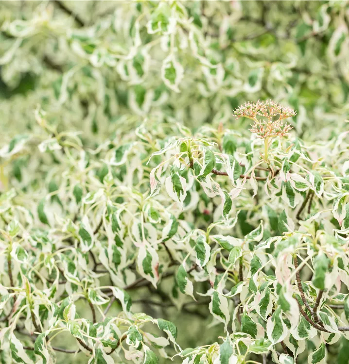 Der Niedrige weißbunte Etagen-Hartriegel 'Argentea' (Cornus alternifolia) ist ein ausladender, breiter Großstrauch, der cremeweiße, in Schirmtrauben angeordnete Blüten mit einem starken Duft hervorbringt. Sie erscheinen im Mai. Zudem trägt der Niedrige weißbunte Etagen-Hartriegel 'Argentea', eiförmige, weißbunte Blätter. An einem sonnigen bis halbschattigen, windgeschützten Standort mit durchlässigem, humosem, saurem Boden erreicht er gewöhnlich eine Höhe von ca. 6 m und wird ca. 5 m breit.