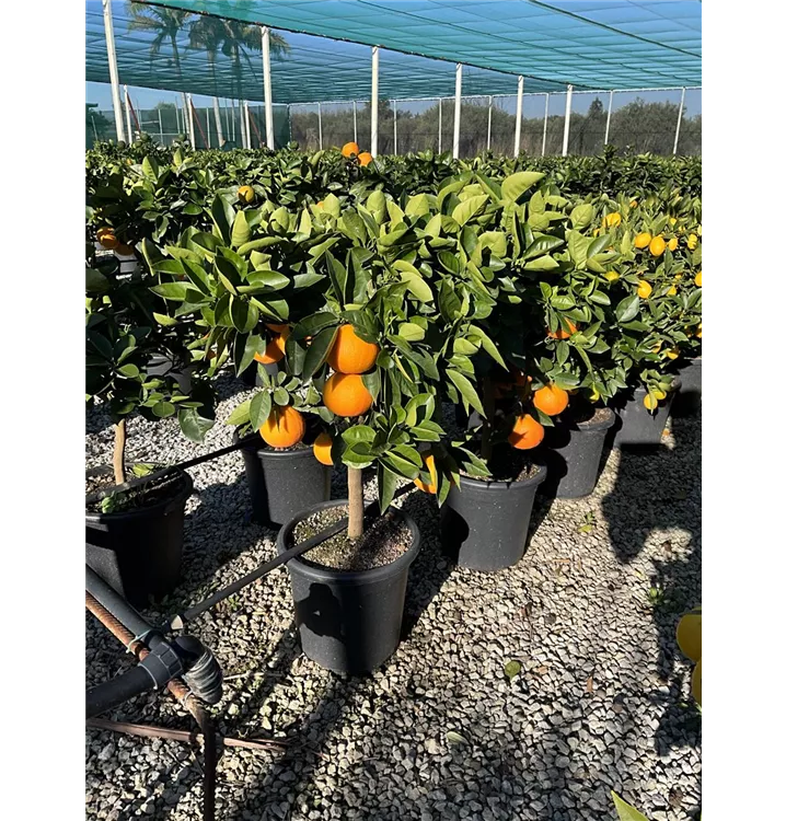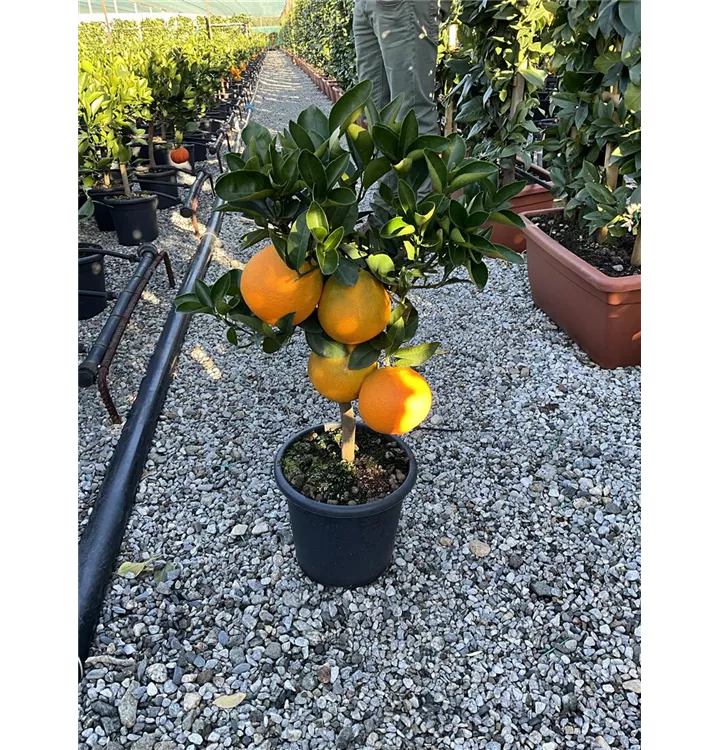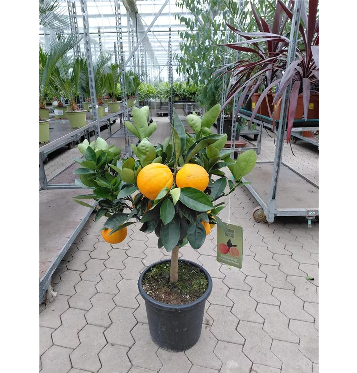 Die Orange 'Navelina' (Citrus sinensis) ist eine sehr beliebte, immergrüne Kübelpflanze, deren orangefarbenen Früchte einen süß-säuerlichen Geschmack haben. Ihre weißen Blüten sind radförmig und erscheinen von März bis Mai. Sie verströmen einen angenehmen Duft. Die dunkelgrünen Blätter sind eiförmig. Der Standort sollte möglichst sonnig bis halbschattig sein. Eine durchlässige und kalkfreie Erde ist dabei ideal. Bei günstigen Bedingungen erreicht die Orange 'Navelina' eine Höhe von ca. 2 m und wird bis zu 1 m breit.