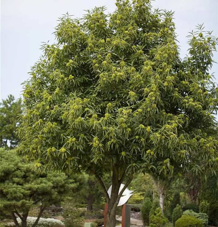 Esskastanie ist ein ausladend wachsender Großbaum. Sie erreicht gewöhnlich eine Höhe von 15 - 30 m und wird ca. 10 - 15 m breit. In der Regel wächst sie 40 - 60 cm pro Jahr.