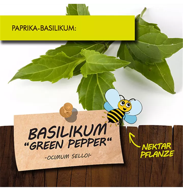 Das leicht pfeffrige-paprikaartige Aroma dieses Basilikums verleiht Speisen eine südamerikanische Note und entfaltet sich erst richtig beim garen. Verwendet werden die jungen Blätter in Salsa, Saucen und Suppen. Frisch fein geschnitten, lassen sie sich aber auch gut z.B. für Pesto, Frischkäse, Dipp und in Salaten verwenden. Das Paprika-Basilikum 'Green Pepper' (Ocimum selloi) ist eine Kräuterpflanze mit einem würzigen, scharfen Geschmack. Für das optimale Wachstum des Paprika-Basilikums 'Green Pepper' werden ein sonniger Standort und durchlässiger, nährstoffreicher Boden benötigt.