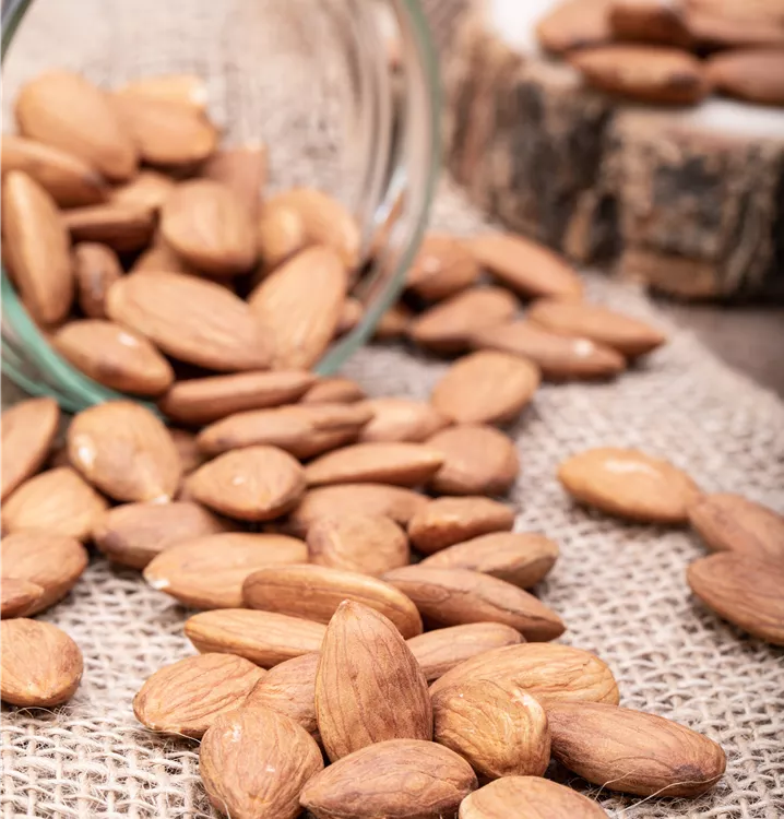 Die Mandel 'Dürkheimer Krachmandel' (Prunus dulcis) bildet braune, mittelgroße Früchte. Sie sind oval und haben einen süßen Geschmack. Für eine ertragreiche Ernte ab Ende September schaffen kalkhaltiger, lockerer, trockener Boden und ein sonniger Standort optimale Bedingungen. Ihre weißen Blüten sind eine schöne Erscheinung. Die Mandel 'Dürkheimer Krachmandel' wird mit ihrem aufrechten Wuchs etwa 5 m hoch und 6 m breit.