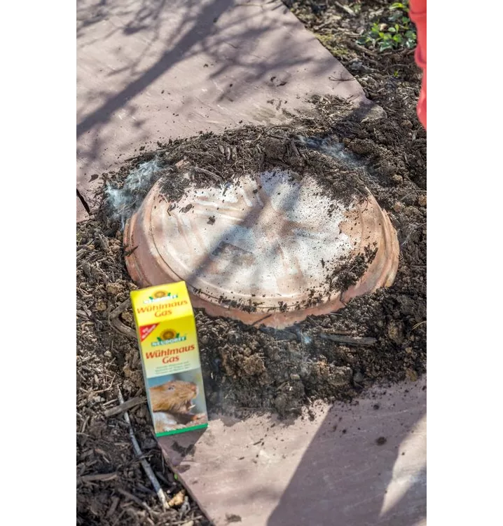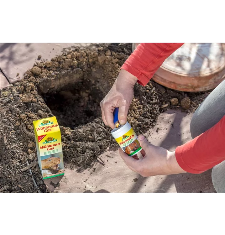 • Einen bewohnten Gang, erkennbar an frischen Wühlmaus- oder Maulwurfshaufen. Mit Hilfe eines Spatens vorsichtig so weit freilegen, dass eine Kartusche dort problemlos platziert werden kann.