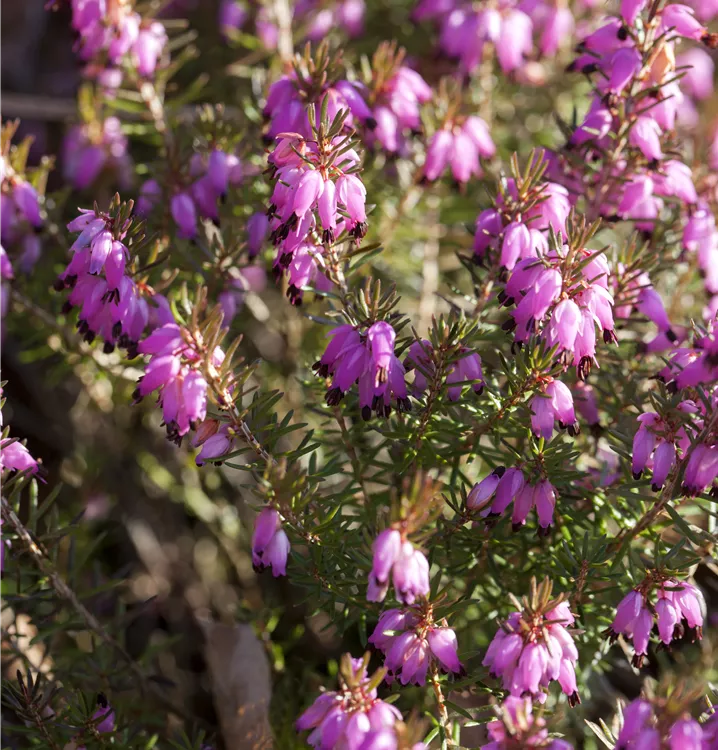 Die Schneeheide (Erica carnea) wird durch ihre unzähligen röhrenförmigen Blüten in Rosa jeden Garten verschönern. Ab Februar ist es soweit und sie begeistert in Beeten, sowie in Kübeln auf Balkon oder Terrasse. Die nadelförmigen, dunkelgrünen Blätter sind ebenso ein schöner Anblick.