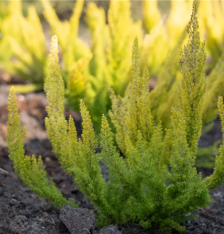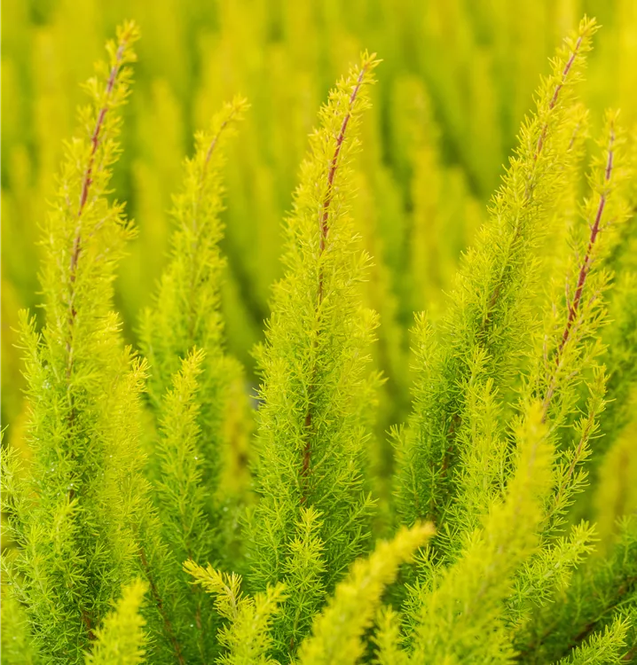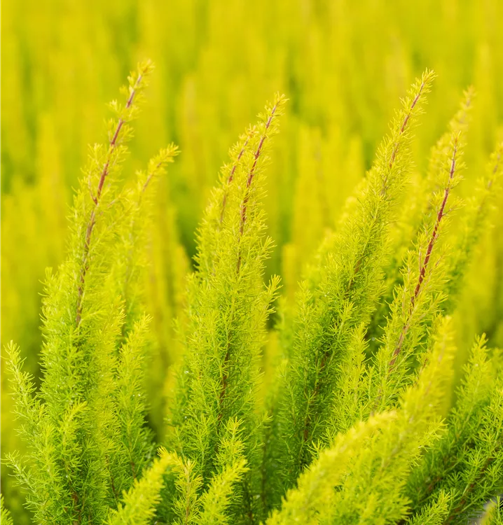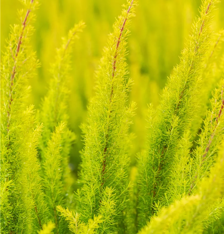 Hoher Blattschmuckwert. Die immergrünen Blätter der Baumheide 'Albert's Gold' sind gelb-grün, nadelförmig.