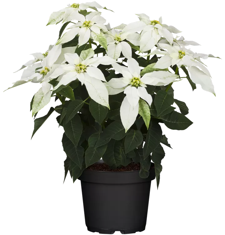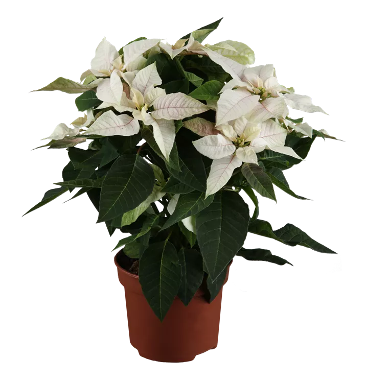 Der Herbststern 'Princettia® Max White' (Euphorbia pulcherrima) ist eine weiß blühende Pflanze, die lanzettliche, mittelgrüne, gezähnte Blätter trägt. Diese buschige und kompakte Pflanze gedeiht am besten an einem hellen Standort.