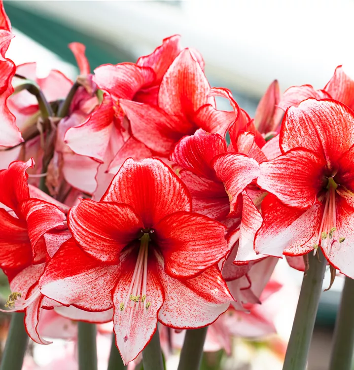 Der Ritterstern (Hippeastrum) bringt ansehnliche, rot-weiße Blüten von Oktober bis April hervor. Bevorzugt wird ein durchlässiger, nährstoffreicher Boden in sonniger bis halbschattiger Lage. Die schlanke Pflanze erreicht gewöhnlich eine Höhe von 50 - 60 cm und wird bis zu 40 cm breit.
