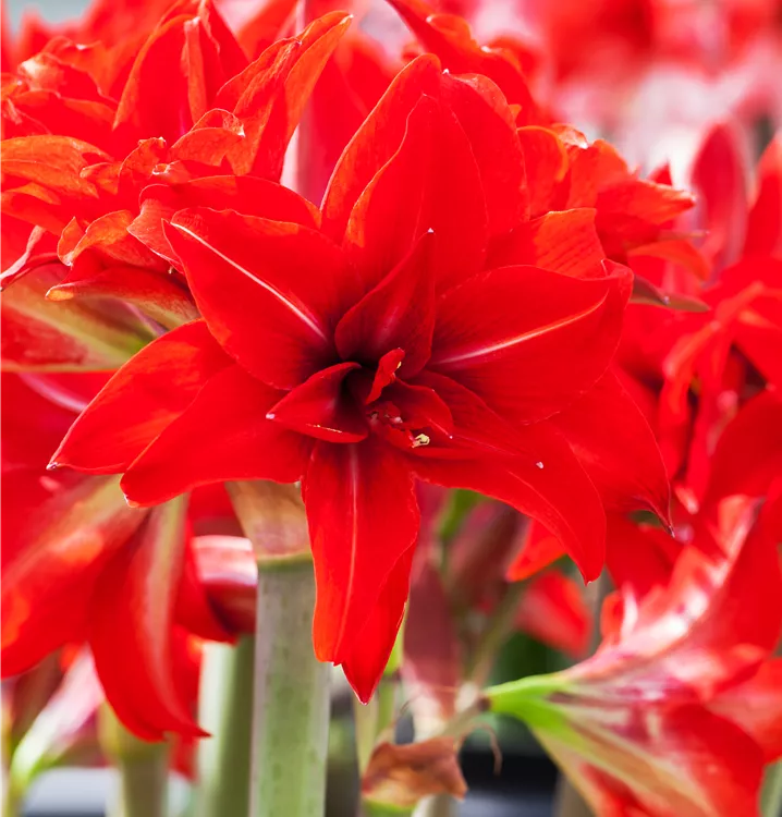 Der Ritterstern 'Double Delicious' (Hippeastrum) bringt ansehnliche, rote, gefüllte Blüten von Oktober bis April hervor. Bevorzugt wird ein durchlässiger, nährstoffreicher Boden in sonniger bis halbschattiger Lage. Die schlanke Pflanze erreicht gewöhnlich eine Höhe von 50 - 60 cm und wird bis zu 40 cm breit.