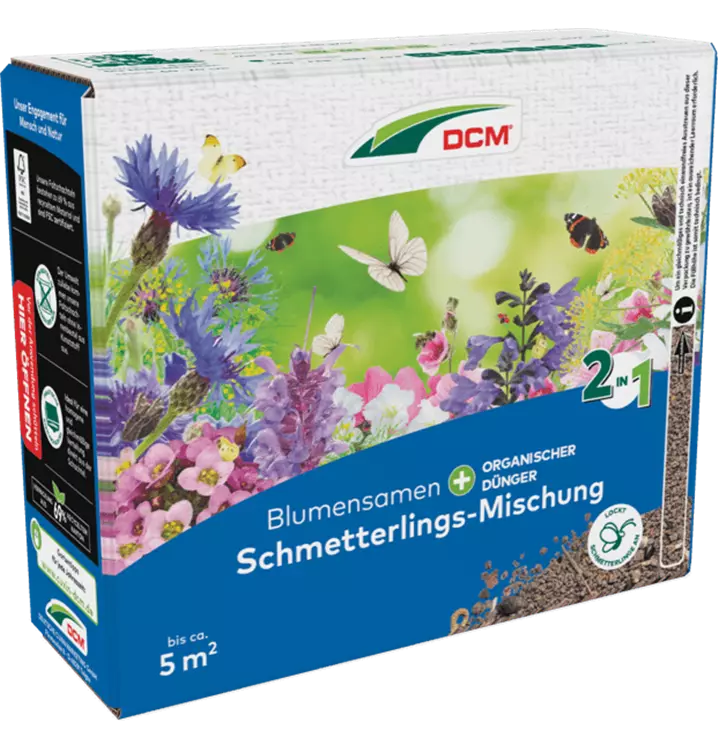 Schu¨tteln Sie die Packung, damit die verschiedenen Blumensamen und der Du¨nger gut vermischt sind. Rechnen Sie ca. 50 g DCM Schmetterlings- Mischung pro m². Fu¨r eine optimale Verteilung streuen Sie die Hälfte der Menge in Längsrichtung und die zweite Hälfte in Querrichtung aus.