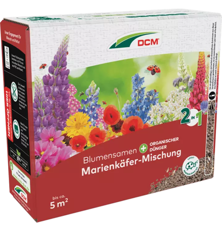 Schu¨tteln Sie die Packung, damit die verschiedenen Blumensamen und der Du¨nger gut vermischt sind. Rechnen Sie ca. 50 g DCM Marienkäfer-Mischung pro m². Fu¨r eine optimale Verteilung streuen Sie die Hälfte der Menge in Längsrichtung und die zweite Hälfte in Querrichtung aus.