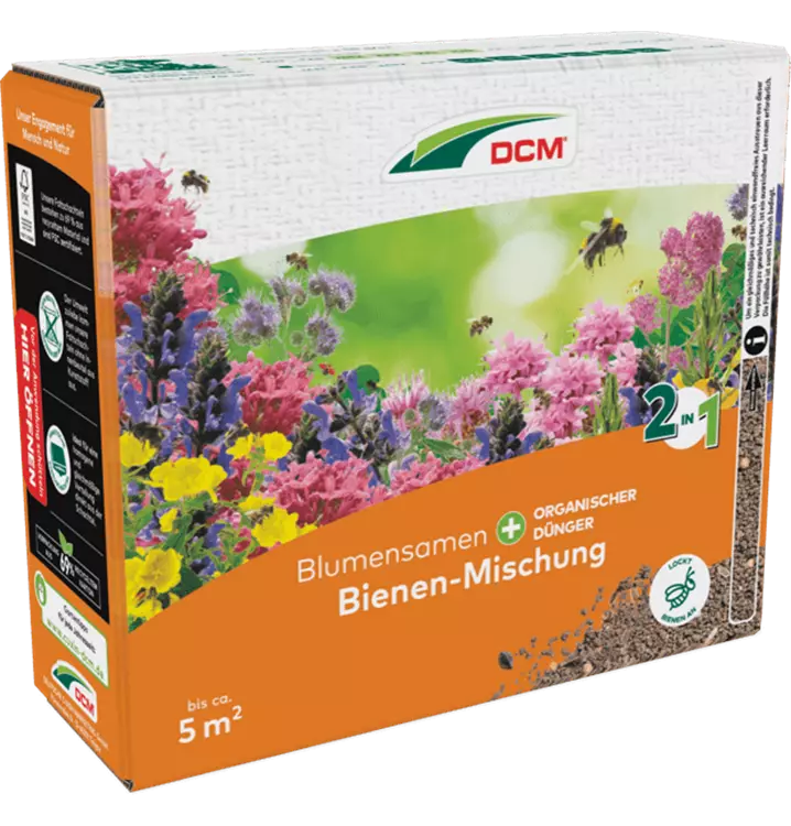 Schu¨tteln Sie die Packung, damit die verschiedenen Blumensamen und der Du¨nger gut vermischt sind. Rechnen Sie ca. 50 g DCM Bienen-Mischung pro m². Fu¨r eine optimale Verteilung streuen Sie die Hälfte der Menge in Längsrichtung und die zweite Hälfte in Querrichtung aus.