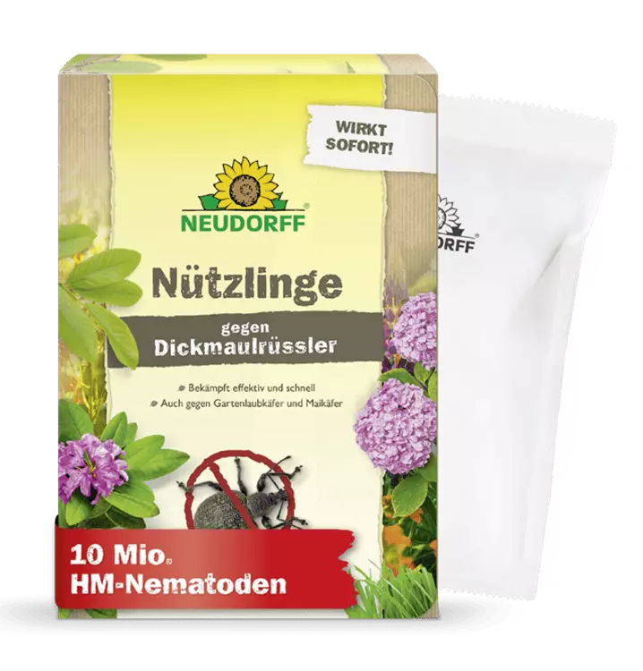 Die Neudorff Nützlinge gegen Dickmaulrüssler (HM-Nematoden) bieten eine natürliche und wirkungsvolle Methode, um Dickmaulrüssler, Maikäfer und Gartenlaubkäfer zu bekämpfen. Diese Schädlinge kommen oft an Sträuchern, in Rasenflächen, Beeten und Zimmerpflanzen vor und schaden den Pflanzen. Die 0,5-1 mm großen Fadenwürmer spüren die Larven der Dickmaulrüssler sowie die Engerlinge der Maikäfer und Gartenlaubkäfer in der Erde zuverlässig auf, dringen in die Larven ein und töten sie sehr schnell ab. Sind keine Larven mehr vorhanden, finden die Nematoden keine Nahrung mehr und sterben ab.