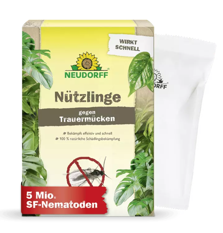 Die Neudorff SF-Nematoden gegen Trauermücken zur natürlichen Bekämpfung von Trauermückenlarven, die oft in Zimmerpflanzen vorkommen und den Pflanzen schaden. Die 0,1 mm großen Fadenwürmer spüren Trauermücken-Larven in der Erde zuverlässig auf, dringen in die Larven ein und töten sie sehr schnell ab. Sind keine Larven mehr vorhanden, finden die Nematoden keine Nahrung mehr und sterben ab. Eine Packung 5 Mio. SF-Nematoden reicht für die Behandlung von bis zu 50 Pflanzen oder einer Fläche von 10 m².