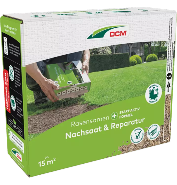 DCM RASENSAMEN NACHSAAT & REPARATUR ist hervorragend zur Reparatur von Rasenlu¨cken, kahlen Stellen im Rasen sowie zur Nachsaat einer lichten Rasenfläche nach dem Winter, dem Vertikutieren oder nach einer Anti-Moos- Behandlung geeignet.