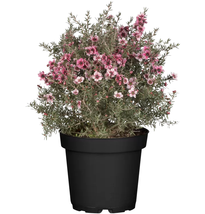 Leptospermum scoparium bildet rosafarbene, weiße Blüten ab April.