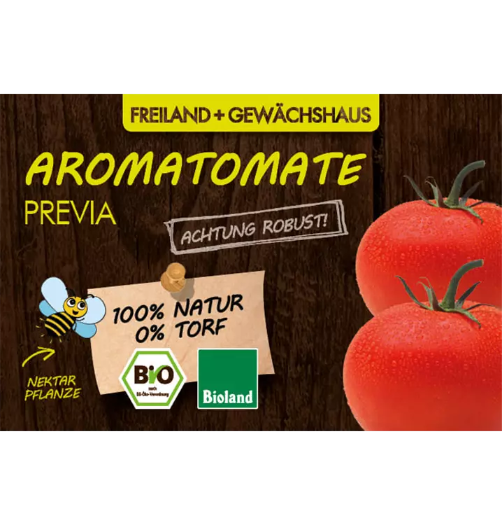 • AROMATOMATE PREVIA: Previa bildet mittelgroße, runde und schnittfeste rote Früchte von 100-110 Gramm. Sie haben ein angenehm schmeckendes kräftiges Aroma. Previa ist hochtolerant gegen die Kraut- und Braunfäule und somit auch bestens für den Anbau im Freiland und Gewächshaus aber auch für den Balkon und Terrasse geeignet. Das Wachstum ist kräftig und vital. Der Geschmack ist überwältigend lecker und wird jeden Tomatenfreund überzeugen. Höhe: 150cm