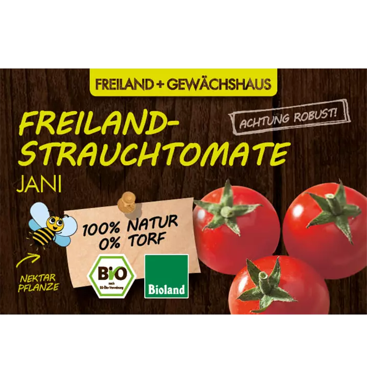 • FREILAND STRAUCHTOMATE JANI: Perfekte kompakte, frühreife Anfängertomate mit roten, geschmackvollen Früchten. Geeignet für Beet und Kübel. Besonders robust gegen Kraut- Braunfäule. Muss nicht ausgegeizt werden! Höhe: 80cm