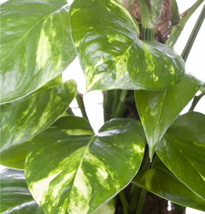 Die Blätter der Gefleckte Efeutute sind gelbbunt, mittelgrün, weißbunt, spitz eiförmig.