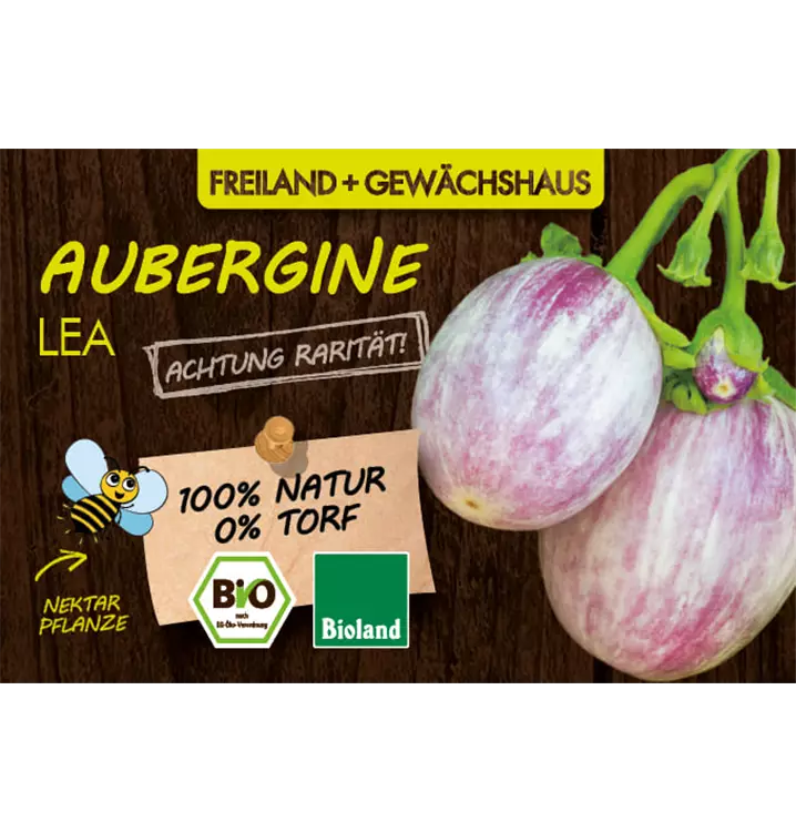 • AUBERGINE LEA: Die schmackhaften, butterzarten und kernarmen Früchte machen mit ihrer weiß-rosa Flammung auch optisch was her. Für Gewächshaus, Beet und Kübel. Königsblüte (erste Blüte) entfernen. Höhe: 70cm