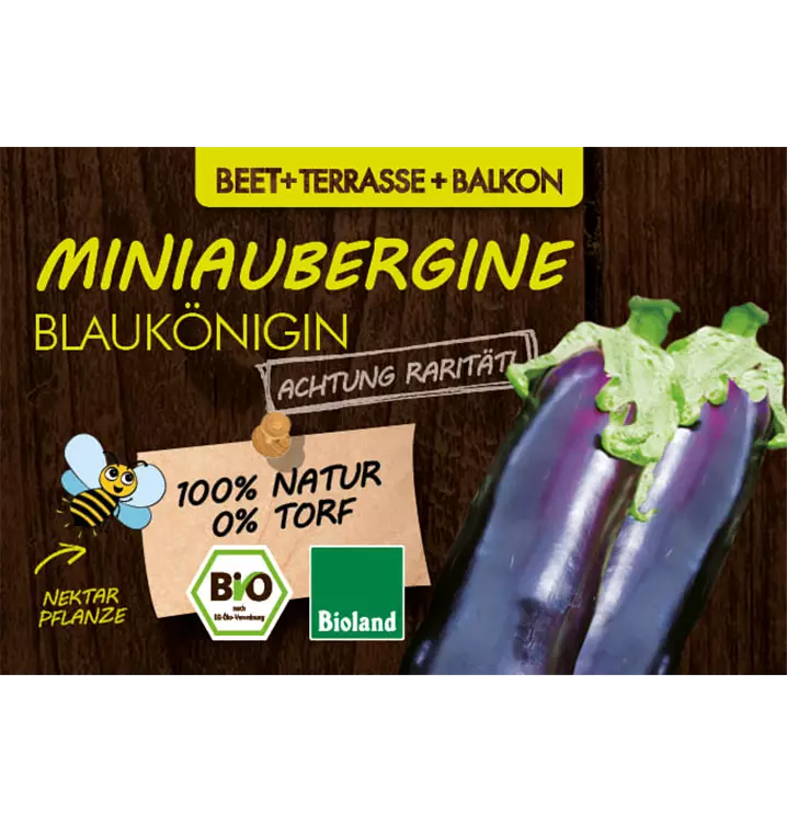 • MINIAUBERGINE BLAUKÖNIGIN: Ertragreiche, anspruchslose, frühe Sorte mit hervorragender Freilandeignung. Intensiv, aber nicht bitter. Die Sorte überzeugt durch ihre mittelgroßen (etwa 150g) violetten Früchte und eine gute Pflanzengesundheit. Die Früchte können wunderbar gekocht und gebraten werden. Insgesamt ist die Sorte sehr anspruchslos und benötigt keinerlei Stützhilfe. Geeignet für Gewächshaus, Beet und Kübel. Königsblüte (Erste Blüte) entfernen. Höhe: 60cm