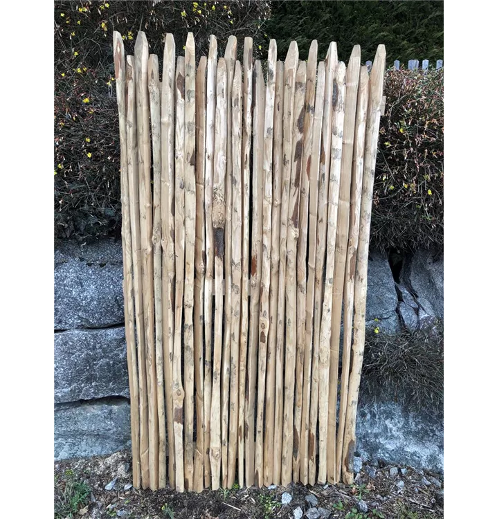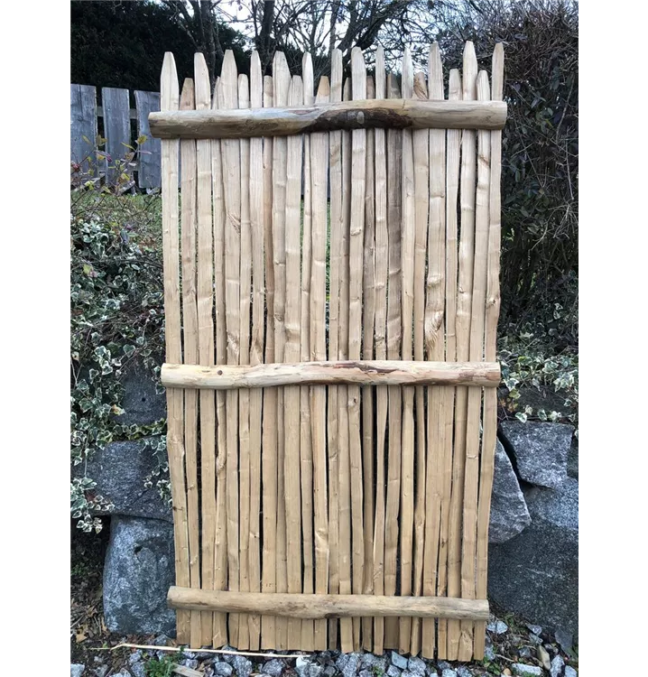 Für das Edelkastanie Sichtschutzelement 'Jura' wurden ca. 25 Stück gespaltene Edelkastanie Staketen in den Höhen 175 und 168 cm mit Edelstahlnägeln auf 3 dünne, 95 cm breite Edelkastanie Querrriegel genagelt.