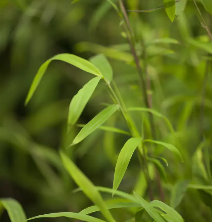 Die immergrünen Blätter des Bambuses 'Great Wall' sind dunkelgrün, lanzettlich. Diese sind etwa 6 - 10 cm groß.