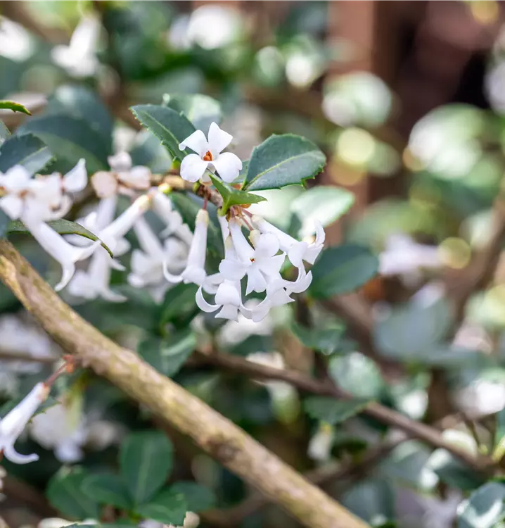 Die cremeweißen Blüten erscheinen von Juli bis August. Diese sind stark duftend.