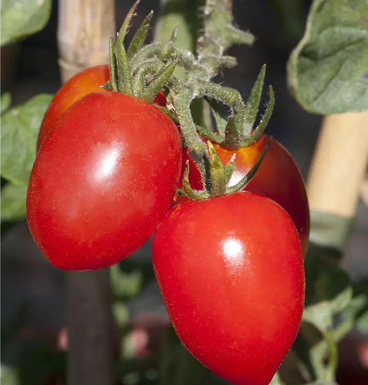 Die Eiertomate 'Roma' (Solanum lycopersicum) bildet kleine Früchte, die aromatisch schmecken und bereits ab Juli geerntet werden können. Für das optimale Wachstum der Eiertomate 'Roma' werden ein sonniger Standort und durchlässiger, nährstoffreicher Boden benötigt.