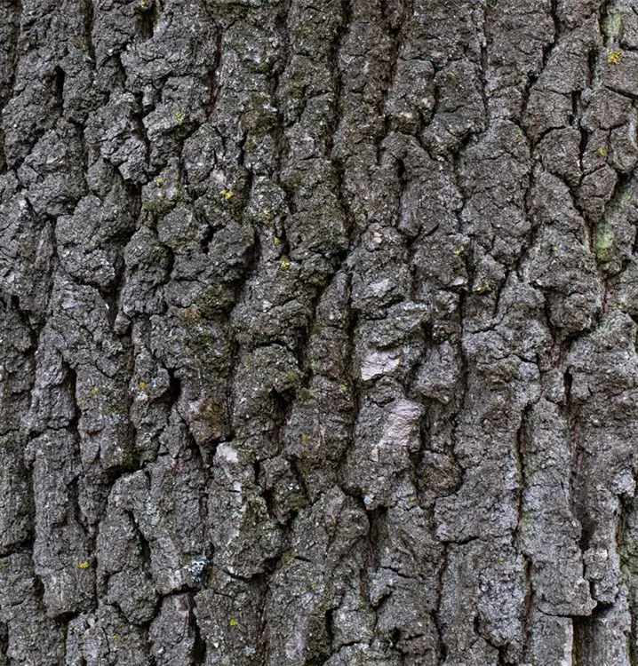 Dunkelgraue, tiefrissige, längsgefurchte Rinde macht diese Pflanze zu einem Blickfang in jedem Garten.