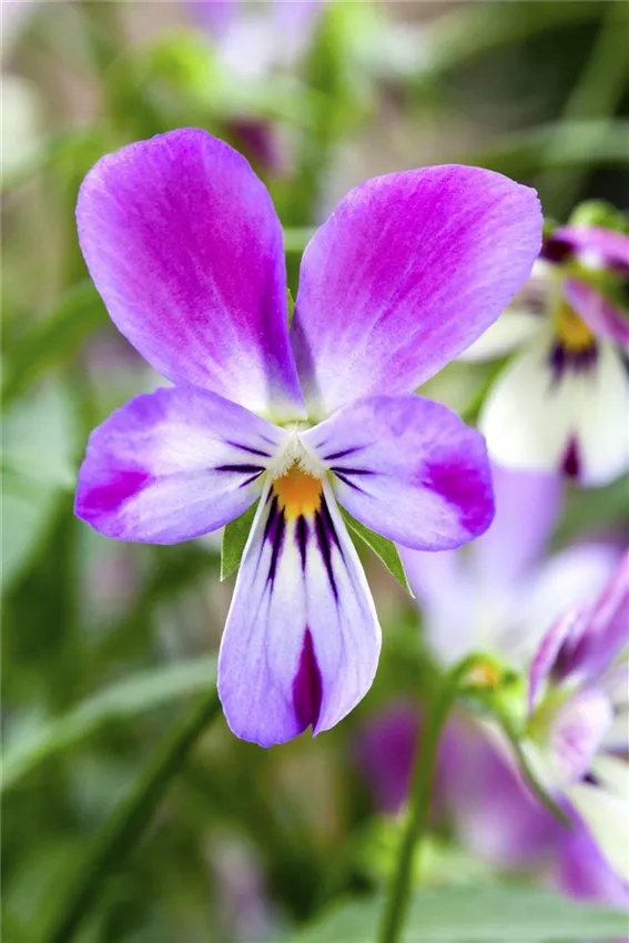 Viola 'Bunny Ears' Die Kiste wird mit Besenheide und Glockenheide aufgefüllt. Wenn sich kleine Lücken gebildet haben, können die mit den rosa Stiefmütterchen aufgefüllt werden. Die passen farblich perfekt zur Heide. Dekorative Äste und Zweige können direkt in die Töpfe der Heide gesteckt werden. Das hält perfekt und verleiht der Kiste mehr Lebendigkeit. Besonders gut eignen sich die Zweige von Hagebutten oder Zieräpfeln, am besten mit Früchten dran. Wer keine Früchte im Gesteck haben will, kann junge Triebe vom Hartriegel nehmen. Die leuchten in einem kräftigen Rot.