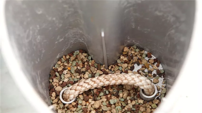 Bauen Sie Ihren Blumentopf mit Wasserspeicher nach Anleitung zusammen. Sollten die Abzugslöcher zu groß sein, so dass das Granulat durchfallen kann, legen Sie einfach ein paar Tonscherben darüber. Füllen Sie eine Schicht des Tongranulats ein.