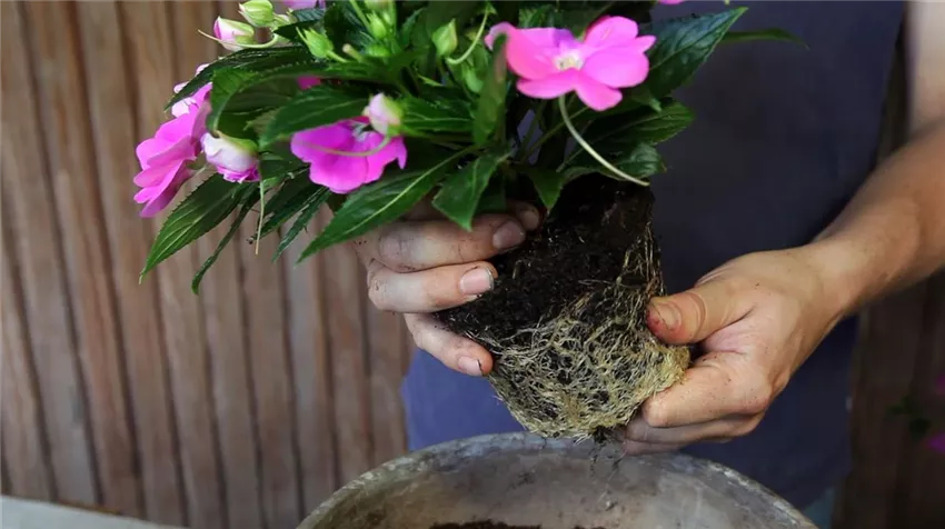 Edellieschen - Einpflanzen in ein Gefäß (3) Wenn Sie die Edellieschen in ein größeres Gefäß umsetzen, entfernen Sie zunächst den alten Topf, damit die Pflanzen neue Wurzeln bilden können und sich so optimal mit Wasser und Nährstoffen aus der neuen Erde versorgen können.