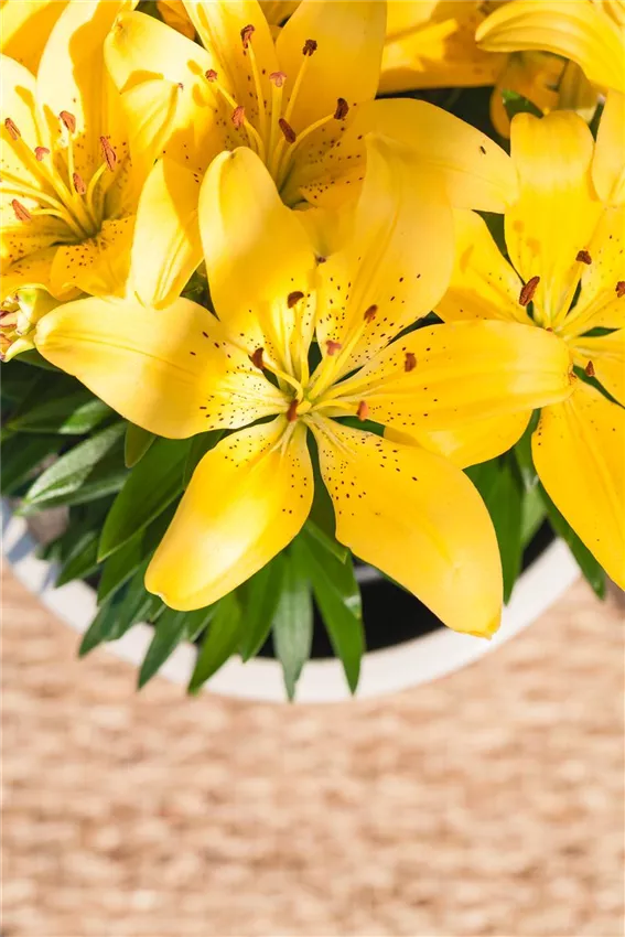 Lilium Asiatic, gelb Die großen Blüen der Lilie mögen es sonnig. Trotzdem sind sie in ihren Heimatregionen oft in Gehölz- und Wiesenbereichen zu finden. Dort ist der untere Teil der Pflanze geschützt. Dieser sollte nämlich schattiert werden. Im Garten erreichen Sie das am besten durch geschickte Pflanzenkombinationen, zum Beispiel mit einjährigen Sommerblumen oder Stauden. Ob Wiesenraute, Storchschnabel oder Großes Schleierkraut: sie untermalen die imposanten Blüten in perfekter Harmonie. Wenn Sie den Blick nicht verstellen wollen, können Sie den Fuß der Pflanze auch mit einer Mulchschicht vor Sonneneinstrahlung schützen. Kleine Liliensorten lassen sich übrigens problemlos in Kübel pflanzen. Dabei müssen Sie vor allem auf einen geeigneten Wasserabzug achten. Im Kübel machen sich zwei bis drei Pflanzen kleinerer Liliensorten in einer Gruppe gut.
