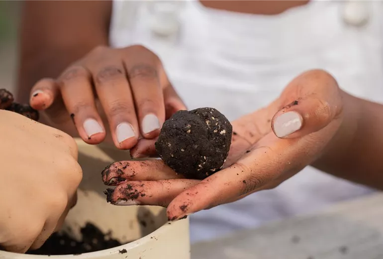Samenbomben gibt es entweder fertig zu kaufen, oder man macht sie einfach selbst. Das geht nämlich genauso schnell, wie sie ins Beet zu werfen. Und die kleinen Samenbomben haben es wirklich in sich: viele Samen, die für bunte Bienenwiesen sorgen.