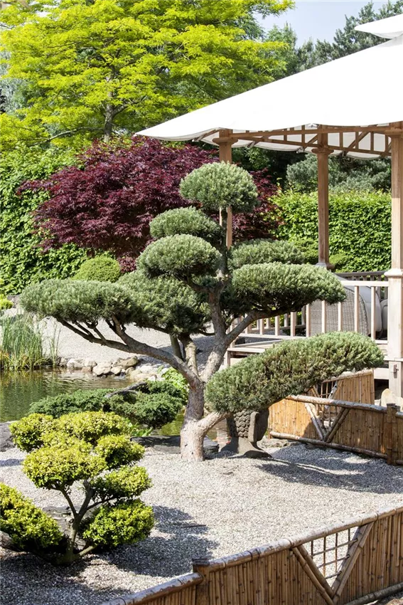 Pinus mugo var. mughus, Bonsai, 25 Jahre alt Gehölze, sowohl Sträucher, als auch Bäume, gehören in den japanischen Garten wie der Kaiser nach China. In der japanischen Kultur stehen Gehölze für das Sinnbild des Lebens und egal ob Nadel- oder Laubgehölz, ein Strauch oder Baum darf im japanischen Garten nicht fehlen. Idealerweise kombiniert man Nadel- und Laubgehölze gekonnt und schafft so verschiedene Bereiche im japanischen Garten. Besonders beliebt und passend zum japanischen Flair sind Formgehölze. Klassische Laubgehölze für den japanischen Garten sind Azalee, Fächerahorn, Rhododendron und die japanische Zierkirsche. Mindestens einer dieser Vertreter darf im japanischen Garten nicht fehlen. Aber auch Bambus, Kiefer oder Buche passen gut in das japanische Konzept und runden das Gesamtbild ab. Was auf gar keinen Fall fehlen darf, ist Moos. Was bei vielen Gartenbesitzern eine ungeliebte Begleiterscheinung im Herbst ist, ist für Fans des japanischen Gartens ein Sinnbild von Dauerhaftigkeit und eines langen Lebens. Durch seine besonderen Wuchseigenschaften und aufgrund der Tatsache, dass es besonders hartnäckig ist, wächst Moos auf nahezu jedem Untergrund, wie arm er auch sein mag. Bewusst gepflanztes Moos ist also ein absolutes Muss in jedem japanischen Garten.