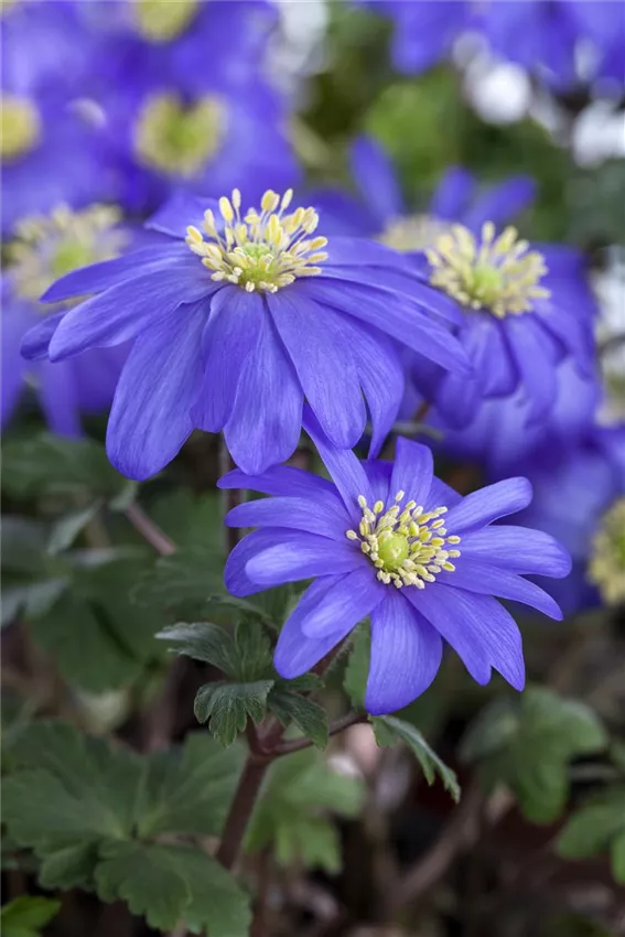 Anemone blanda, blau Wenn der Garten die ganze Saison lang blühen soll, sind Anemonen die beste Wahl. Fällt der Monat mild aus, öffnet die bekannte Balkan-Anemone ihre Blüte schon im Februar. Wenn andere Gärten noch schlafen, erwacht der Anemonen-Garten in Weiß-, Blau- oder Rosatönen. Die Balkan-Anemone gehört zu den kleineren Vertretern ihrer Art und wird 10 bis 15 Zentimeter hoch. Kurz darauf folgt die Blüte vom Buschwindröschen. Seine Blüten sind klein und oft weiß. Einzelne Sorten kommen in zartem Rosa oder in hellem Blau daher. Die kleinen Anemonen zaubern schon im ausgehenden Winter Blütenteppiche unter Bäume und Sträucher oder auf andere schattige Flächen. Im Sommer kommen dann Gartenanemonen an die Reihe. Sie blühen im Juni um die Wette. Die Gartenanemonen sind auch bekannt als Kronenanemonen. Dank ihrer hübschen Blüten in zahlreichen Farben, auch dunklen Tönen wie Blau und Violett, sind Kronenanemonen beliebte Schnittblumen. Ab August bis in den Oktober folgen die Herbst-Anemonen. Auch in der dunklen Jahreszeit können Sie mit Anemonen den Garten in ein buntes Farbenmeer tauchen.