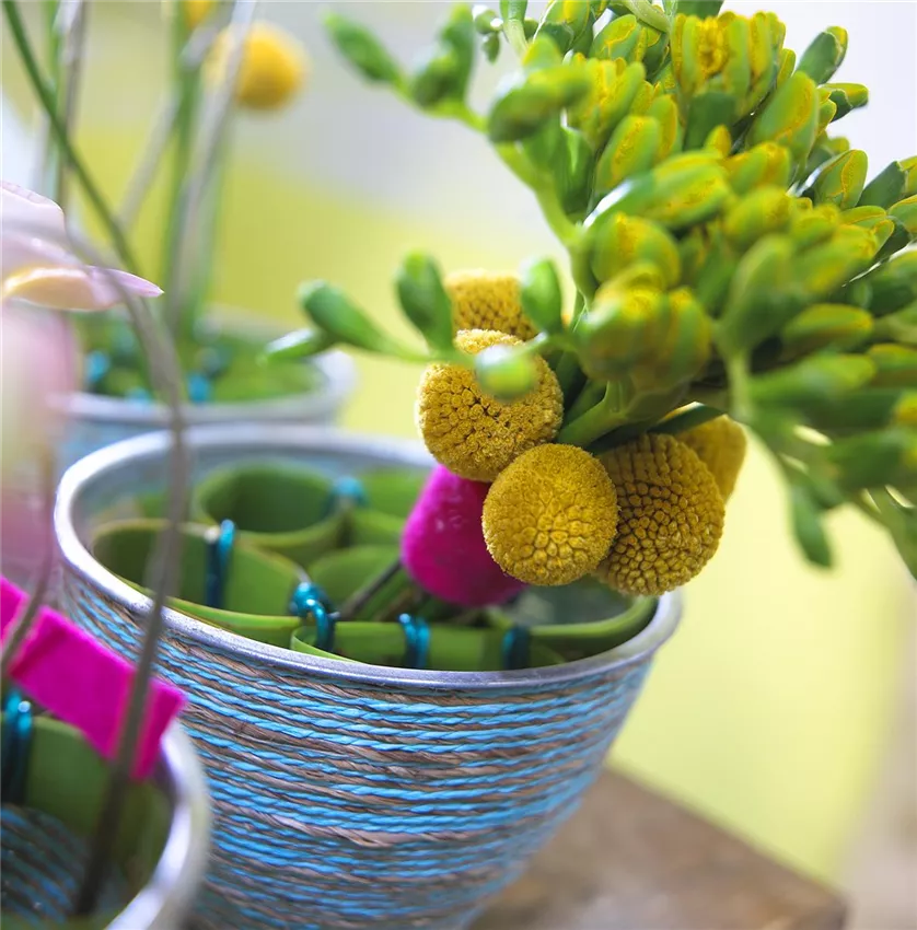 „Steckhilfen“ heißt das Zauberwort. Als Material eignet sich alles, was verhindert, dass die einzelnen Blumen ineinander rutschen. Dafür können Sie natürliche Röhrchen verwenden, z.B. hohle Bambushalme, oder auf eine künstliche Variante, z.B. Lockenwickler, zurückgreifen. Diese Hilfsmittel füllen die Vase schneller aus als die dünnen Blütenstiele.